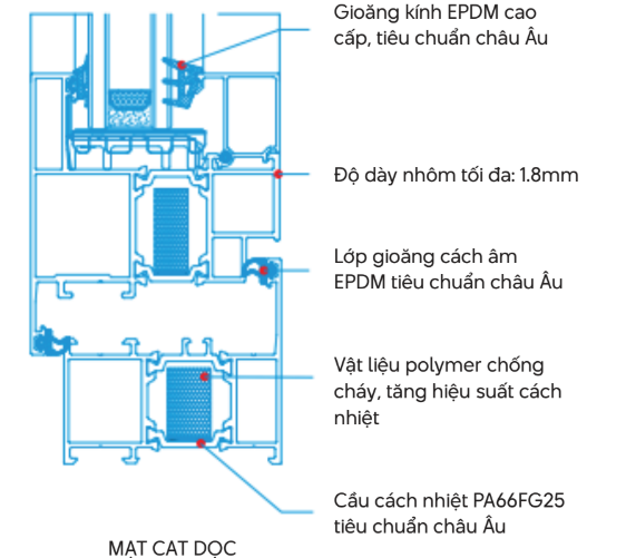 Khả năng cách nhiệt, cách âm và chống chịu thời tiết vượt trội; hệ thống phụ kiện kim khí ổn định, an toàn và bền bỉ; lớp phủ MED độc quyền & siêu cao cấp, bề mặt siêu mịn.